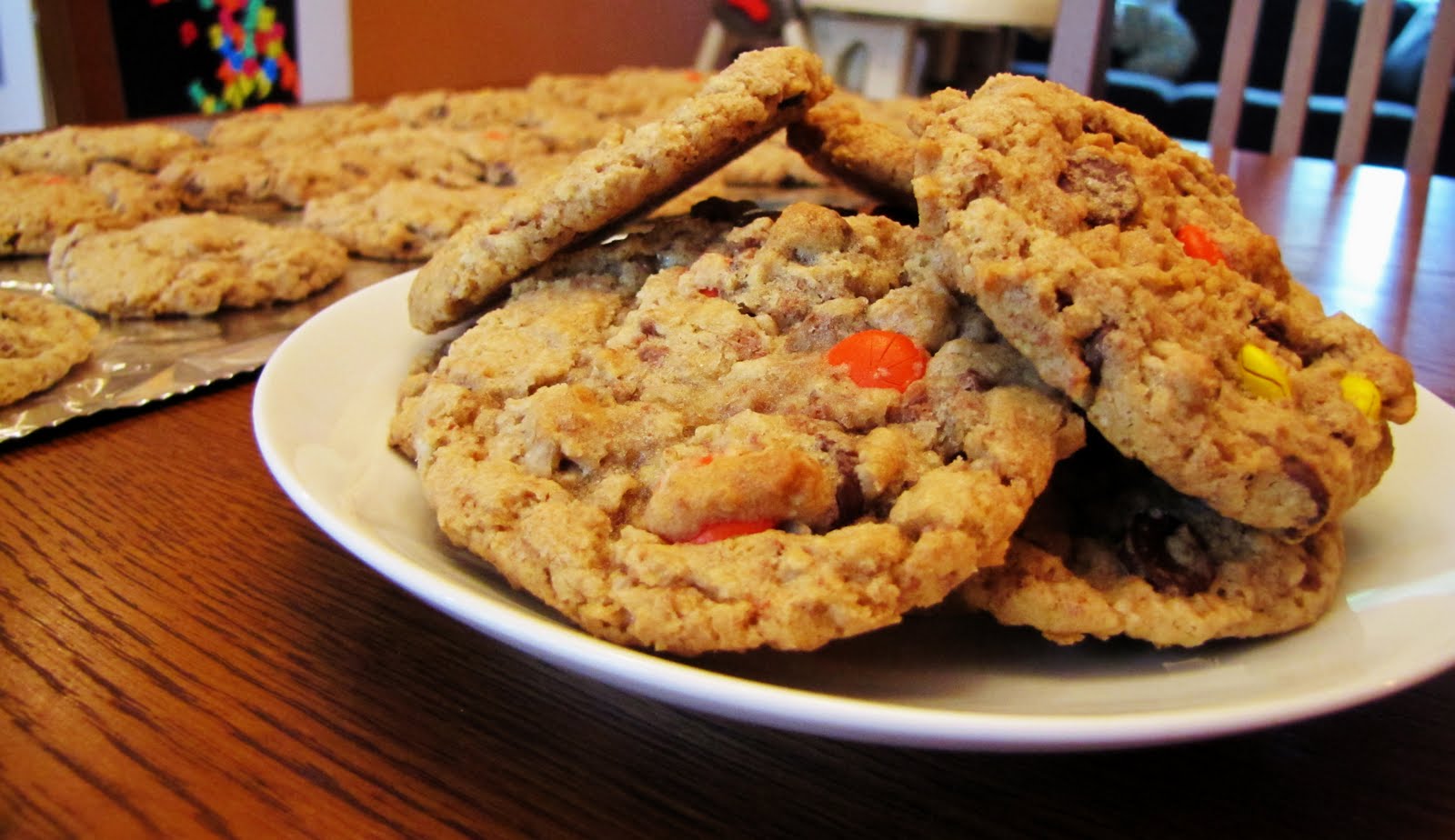 In a large bowl, cream together butter and sugars. Beat in the eggs one at a time, then stir in the vanilla. Add flour, oats, salt, baking powder, and baking soda. Stir dry ingredients into creamed butter and sugar. Add chocolate chips, grated chocolate, and Reeses Pieces.