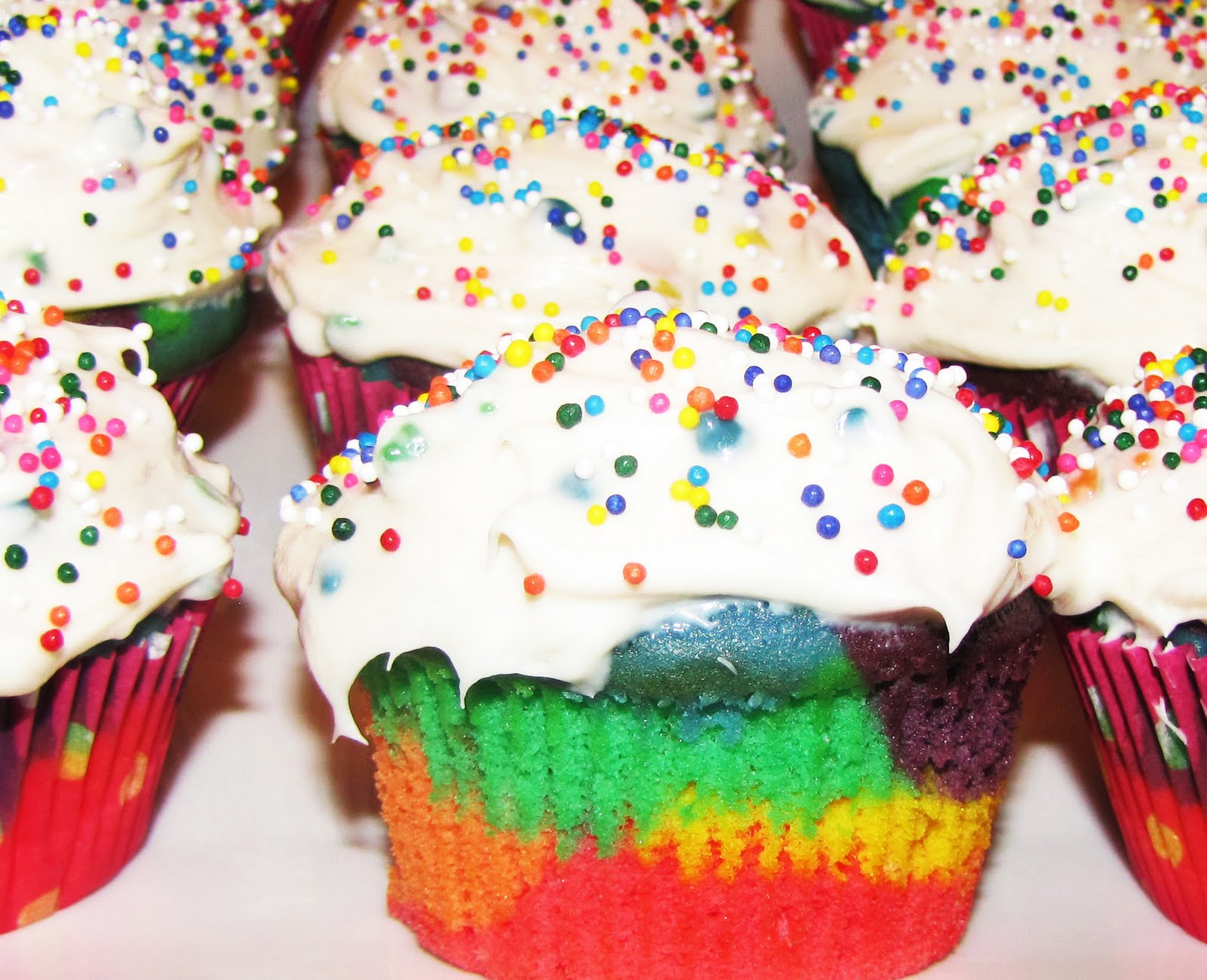 I just wanted to play around with these this evening, so I used a white cake mix, some rainbow chip frosting (my hubby’s favorite) and here they are! Super cute, next time I will have to spend time decorating them to make them cute.