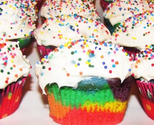 Layer colored batter in the order of a rainbow’s colors into cupcake liners. Remember the order? Red, orange, yellow, green, blue, indigo (I skipped this one), and violet.