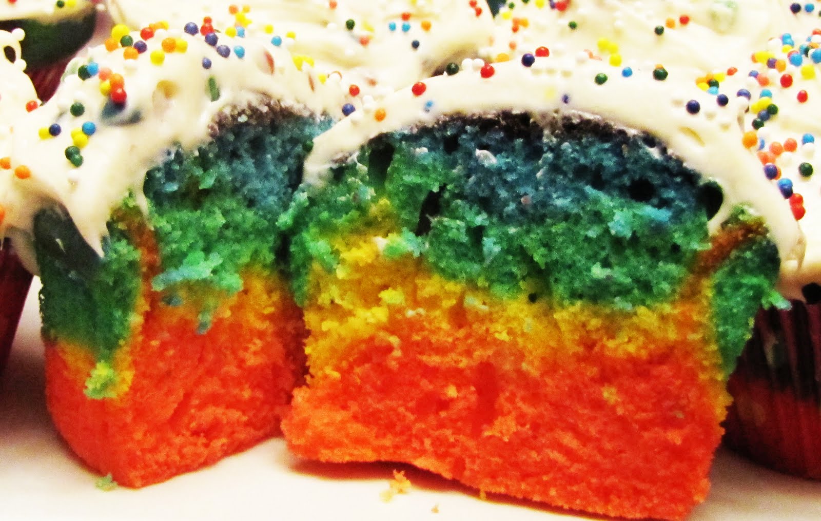 This is simple to do by dividing the batter equally among six small bowls. Color each bowl of batter a different color. I made- red, orange, yellow, green, blue, and purple.