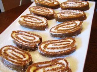 Unroll pumpkin cake when cool, and spread with filling. Reroll, and push aside the dishtowel. Unroll long sheet of waxed paper. Put pumpkin roll on waxed paper. Dust pumpkin roll with powdered sugar. Twist ends of waxed paper like a piece of candy. Put pumpkin roll in refrigerator and chill overnight. Before slicing, dust with powdered sugar. Serve chilled.