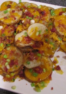 Slice potatoes and place on a baking sheet with some olive oil. Season with garlic powder, salt, and pepper. Bake in 450° oven about 20 minutes, until fork tender. Remove from oven, and top with cheese, onions, bacon, and a little more cheese. Place back in the oven for about 5 minutes until cheese is melted. Serve with sour cream.