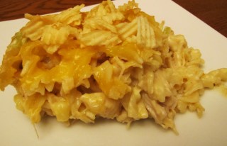Pour into a 9×13 inch baking dish, and top with cheese and crushed potato chips. Bake at 350° until cheese is melted and potato chips are browned. Enjoy!