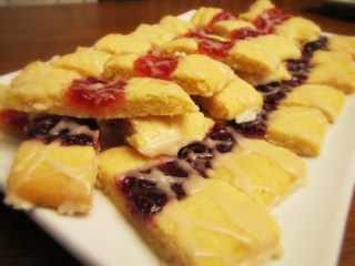 Fill depressions with jam. Bake 10-15 minutes longer or until lightly browned. Cool for 2 minutes and cut into 3/4-in. slices. Leave on cookie sheet until they are completely cool, or they will fall apart.