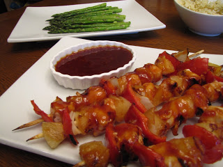 Place the chicken, vegetable, and pineapple pieces onto the skewers to your liking. Pour half of the sauce into a small bowl then brush the skewers with the sauce.