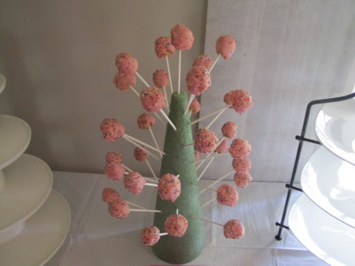 Place lollipop sticks through the end of each doughnut hole. Melt candy melts (make sure not to burn) and stir until smooth. Dip each doughnut hole into the candy melt mixture and cover with sprinkles. It helps to have some sort of foam to stick the sticks into while they dry. I used my foam “tree” which I found at Joann Fabrics, and I just left them in there for the shower. If you placed them on parchment paper or something, they would stick. Highly recommend some kind of foam. 🙂 Enjoy!