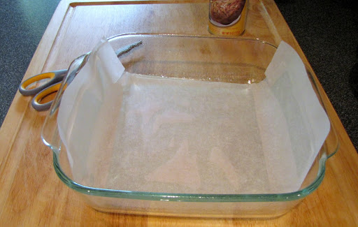 Spread the batter out into a lightly greased 8 by 8 inch baking pan. You could also make a parchment paper “sling” if you like, to pull the blondies out all together nicely. Make sure you still grease your pan if you make a sling. (See below)
