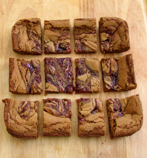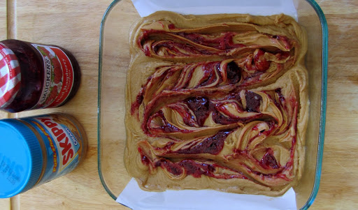 Take a knife and swirl the peanut butter and jam throughout the blondie batter. Just randomly swirl the peanut butter and jam.