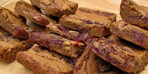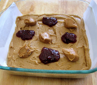Place 1/2 Tablespoons of peanut butter and 1/2 Tablespoons of jam on top of the blondies.