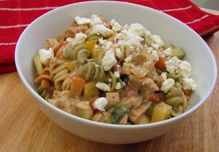 I think this is probably my husband’s favorite thing I cook. It is a staple at our house in the summer. Tri-color rotini pasta is mixed with colored bell peppers, red onions, cucumber, chicken (or peperoni) and feta cheese. It keeps beautifully in the fridge for several days, and is great for either lunch, or as a side dish to some salmon or kabobs for dinner.