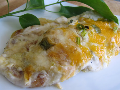 In a small bowl combine the reserved 3/4 of the sauce with the milk. Spoon this mixture over the rolled tortillas and top with the remaining 1/2 cup of shredded Cheddar cheese. Bake in the preheated oven for 30 to 35 minutes, or until cheese is bubbly.