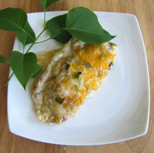 Put a little oil on a griddle or frying pan and warm/lightly brown each tortilla. Fill each flour tortilla with the chicken mixture and roll up. Place seam side down in the prepared baking dish.