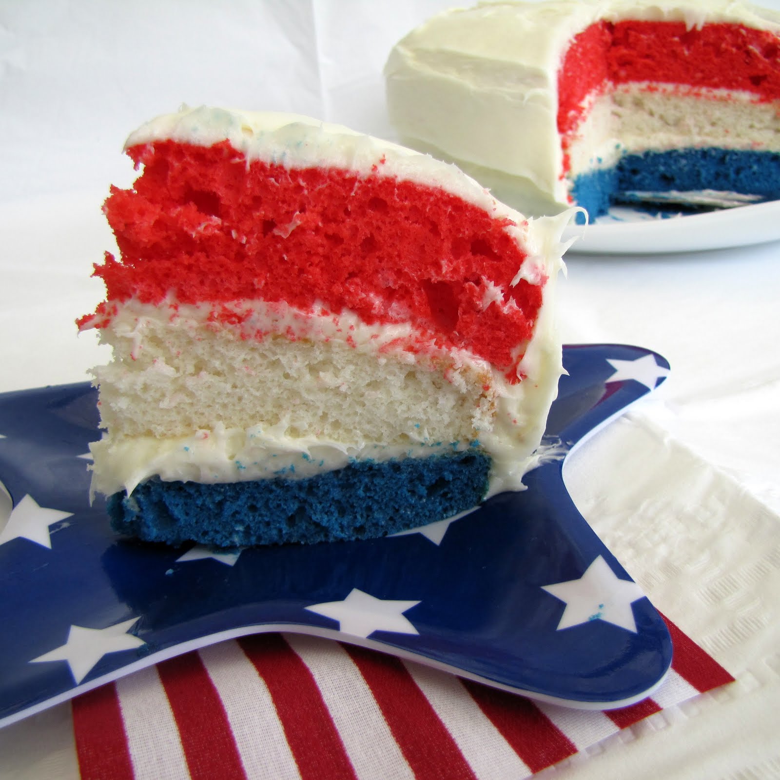 Let each layer cool completely, and assemble cake blue on bottom, white in the middle, and red on top, with a thin layer of frosting in between each layer. Frost the top and sides after cake is assembled. Enjoy!