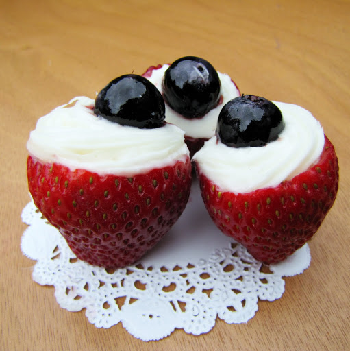 Clean and hull your strawberries and cut the bottom tips for a flat edge. Fill each strawberry with the cream cheese mixture. Nuke the jam in the microwave for about 10 seconds and stir. Toss the blueberries in jam. Top each cream filled strawberry with a blueberry. Don’t top with blueberries until you are ready to serve.