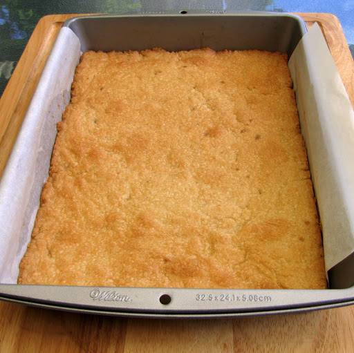 Break the dough into small chunks and press into the bottom of the prepared pan in an even layer. Bake for 20 minutes. Cool on a wire rack for 5 minutes.