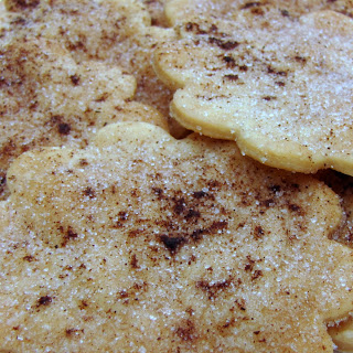 Roll dough from center outward with steady pressure on a lightly floured work surface and use a cookie cutter to cut into shapes. Sprinkle with cinnamon and sugar and bake for about 8 minutes, until the edges are lightly browned.