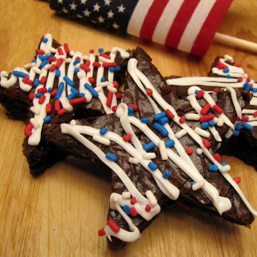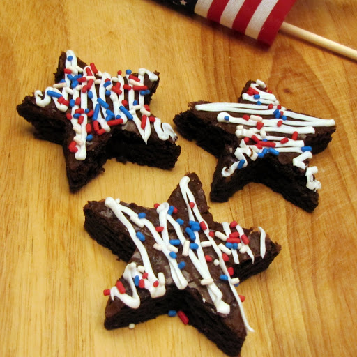 Let the brownies cool completely, and cut them out with a star shaped cookie cutter. Decorate them with white frosting, and red, white, and blue sprinkles.