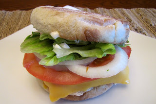Toast English muffins, and spread mayo and mustard on each side, and put lettuce, onion, and tomato on one side. When chicken is done, cut the breast in half and place a slice of cheese on each half of the hot chicken.
