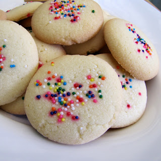A spritz cookie is a delicate, shortbread like cookie, that is normally pressed into a pretty shape with a cookie press. My cookie press is currently on the fritz, so I just rolled the dough into little half inch balls, flattened them a bit and added sprinkles.