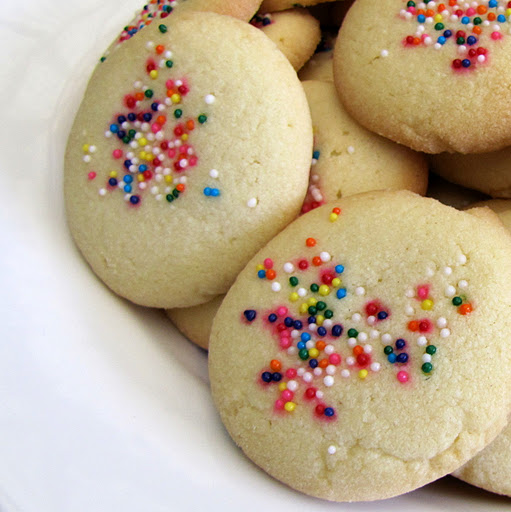 A spritz cookie is a delicate, shortbread like cookie, that is normally pressed into a pretty shape with a cookie press. My cookie press is currently on the fritz, so I just rolled the dough into little half inch balls, flattened them a bit and added sprinkles.