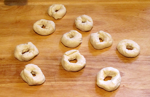Open your biscuit dough and roll each biscuit into a disk. Poke a nice sized hole in the center of each disk.