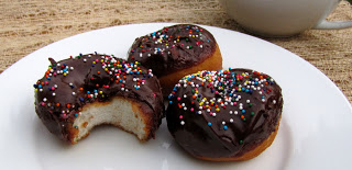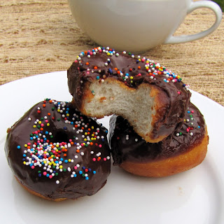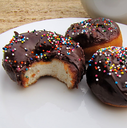 Dip warm doughnuts about half way into the chocolate glaze. Cover with sprinkles for extra flair.