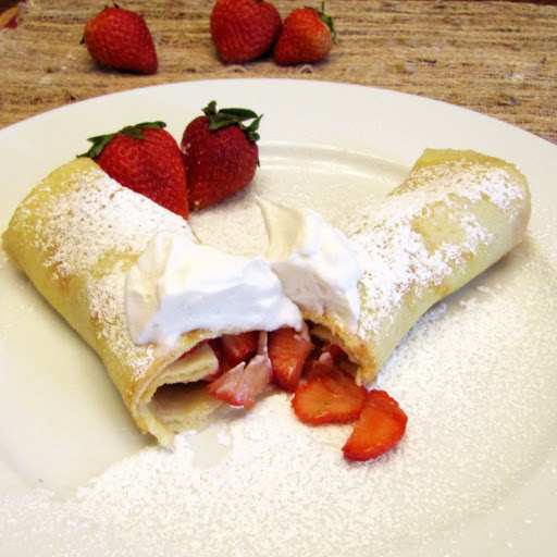 To serve, fill each crepe with 1/4 cup sliced strawberries and roll up. Top with a dusting of powdered sugar and a dallop of whipped cream.