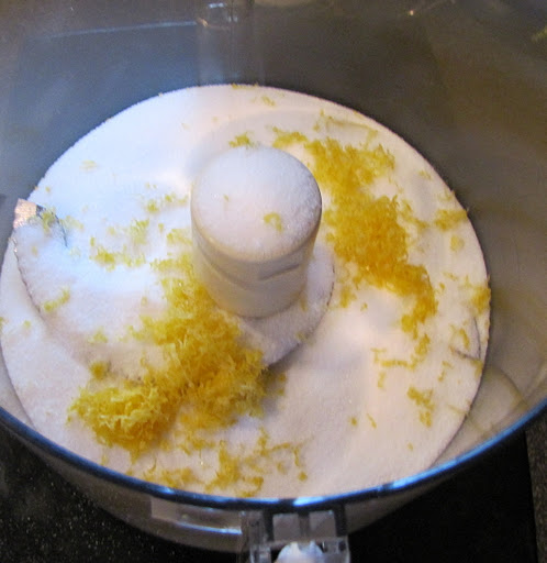 In a large bowl, combine the lemon zest and 1 cup sugar. Using your fingertips, rub the zest into the sugar until it becomes moist and fragrant. (I used my food processor, and just pulsed the sugar and lemon together a few times)