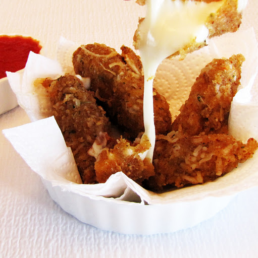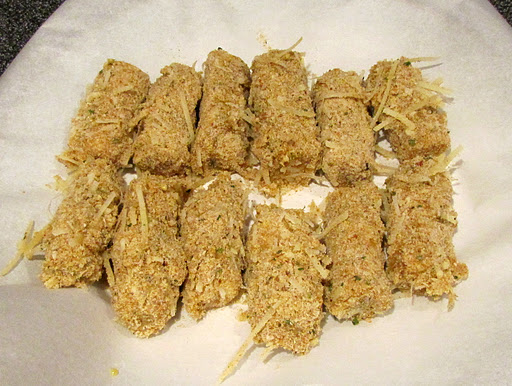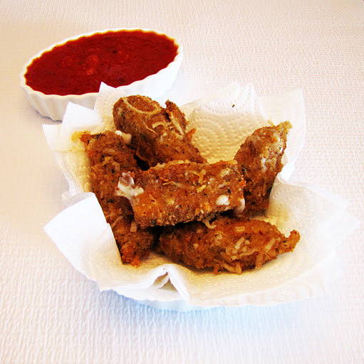 2 (16-ounce) blocks pasteurized mozzarella cut into 4 by 1/2-inch sticks (I used string cheese, cut in half- also, if you use a block, two blocks may be excessive, unless you’re cooking for a lot of people)
