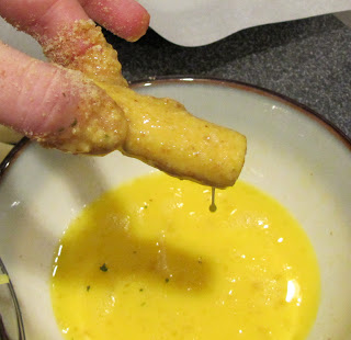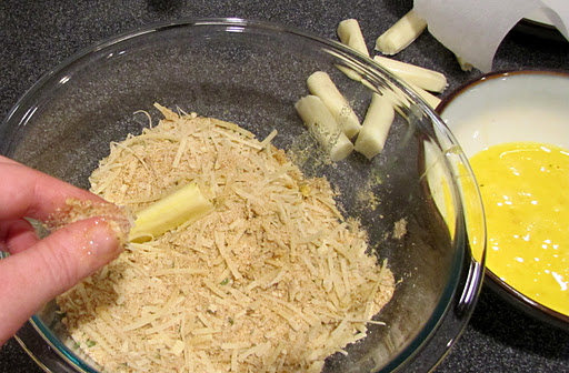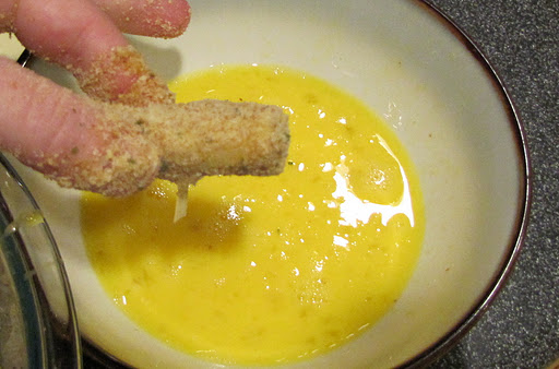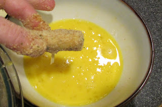 Repeat dipping the cheese sticks in the egg and bread crumb mixture to coat a second time. As you can see, this is messy business.