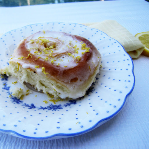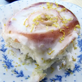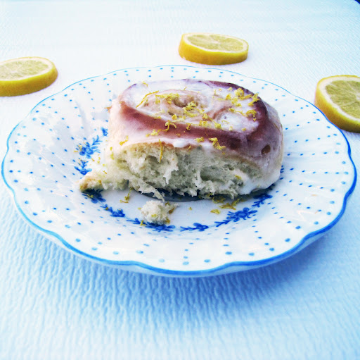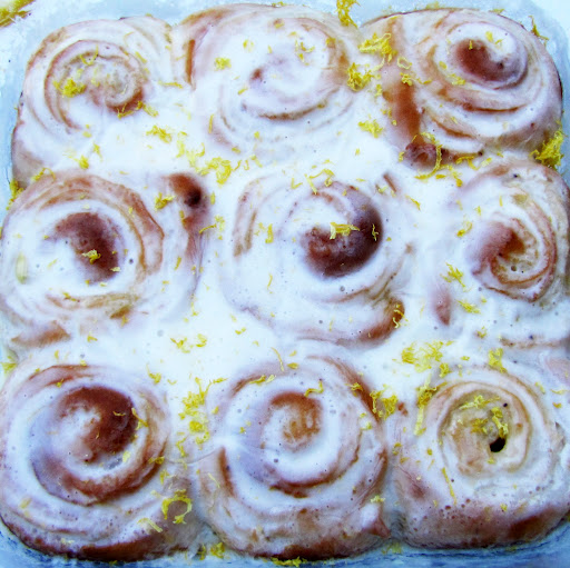 When the rolls are done, smear them with the cream cheese glaze, and sprinkle the final part (1/3) of the lemon zest over top to garnish. Let cool for at least 10 minutes before serving, but do serve while still warm.