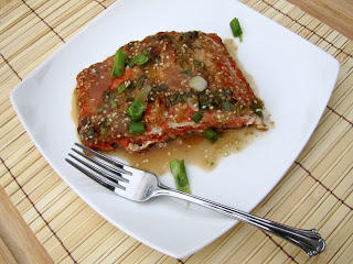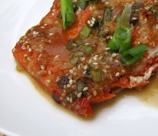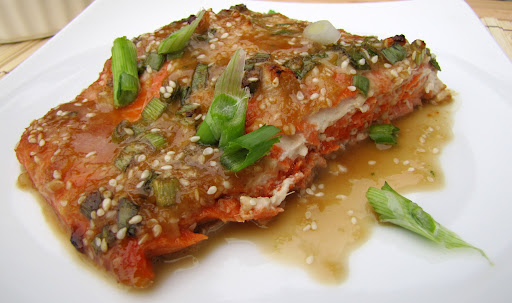 Remove and serve immediately, with a sprinkling of toasted sesame seeds, green onions and the glaze below.