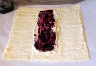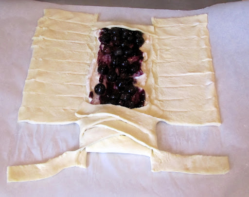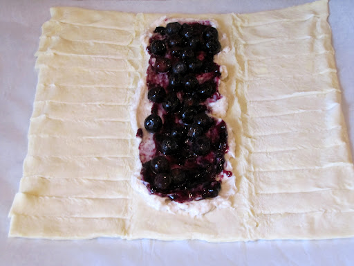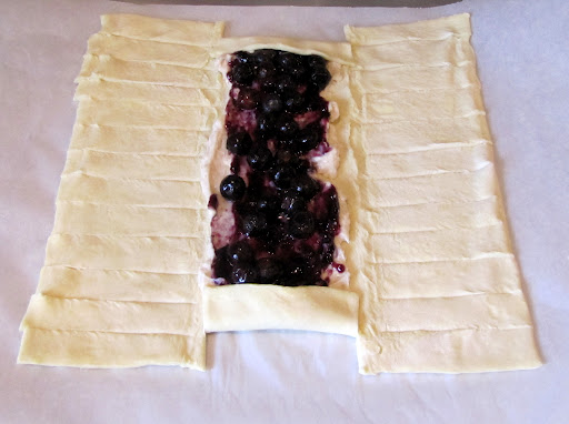 Spread out your puff pastry sheet on a parchment-paper-lined sheet tray. On the outside sections, cut diagonal strips that are about 1/2 inch wide. Cut small slits on the creases at the top and bottom of the pastry. Spread the cream cheese mixture on the pastry sheet, leaving room on the ends. Spread the blueberry preserves on top of that. Add blueberries on top of that.
