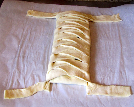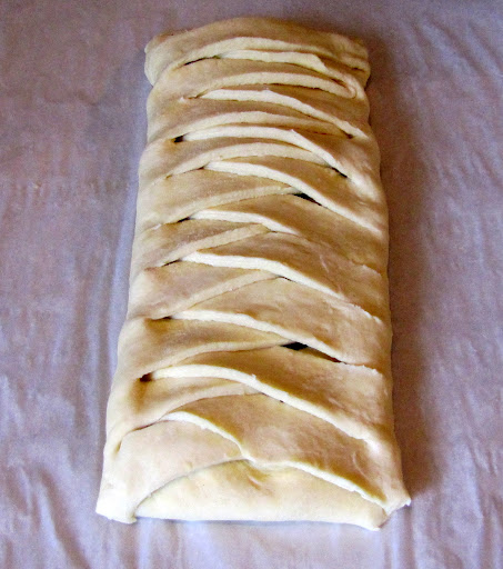 Fold the top and bottom of the pastry over the filling, and start folding the strips over the filling, alternating between the left and right side. Make sure there are no gaps. Cut the wings off the corners and pinch to seal. Press any seams together to minimize filling leakage. **Directions with photos below**