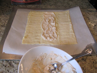 Spread on cream cheese mixture, leaving space at the ends.