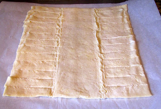 With your first full strip, start folding over the middle, alternating between left and right. Fold tightly and be sure there are no gaps. Gaps=places where the awesome filling can escape. Bad news.