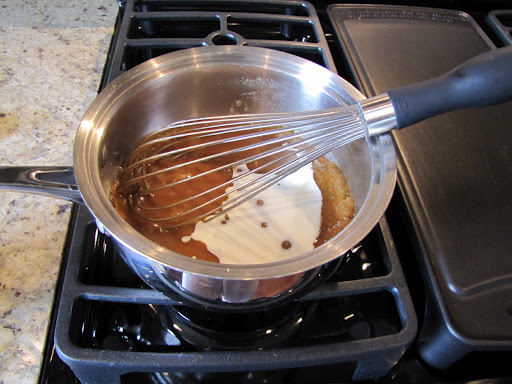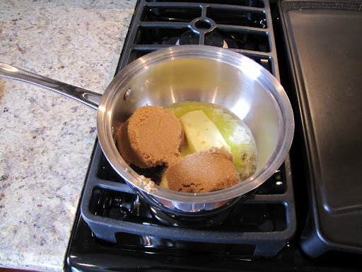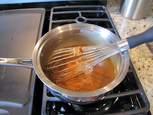 In a saucepan over medium high heat, melt the butter. Add in the brown sugar and whisk, bringing it up to a boil.