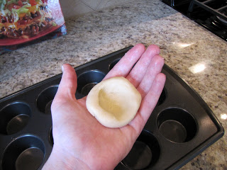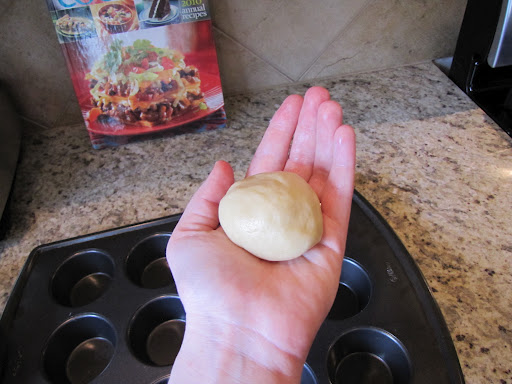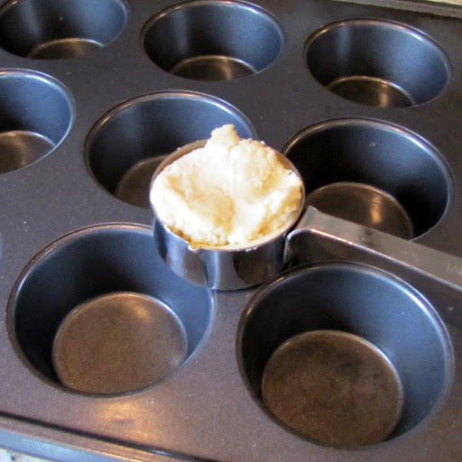 Now, get out a muffin tin. Don’t grease it or anything. Take a heaping quarter cup of snickerdoodle dough.