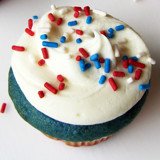 Bake according to package directions, and once cool, frost with frosting and patriotic sprinkles.