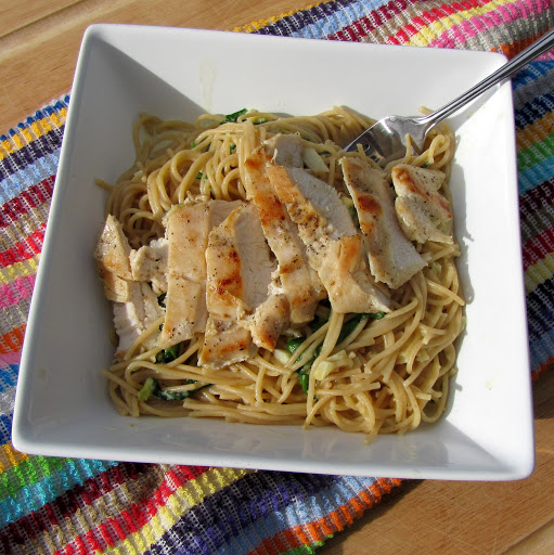 I had some leftover spaghetti noodles in the fridge that I needed to use up, and chicken in the freezer, so I threw this dinner together in about ten minutes. Ten minutes, and it tasted like something out of a good Italian restaurant. Creamy and delicious- and healthy too!
