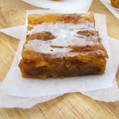 Bake cake for 30-35 minutes, until cooked through and remove. Place powdered sugar and cream into a large bowl and mix until creamy and smooth. Drizzle over warm cake then let cool for 20 minutes before cutting into squares.