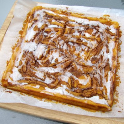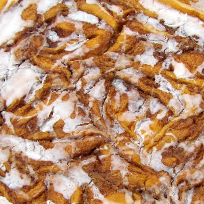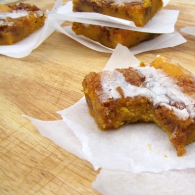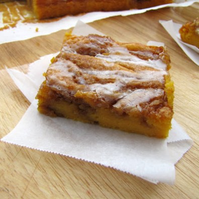 Sweet, pumpkin cake, drizzled and swirled with sweet, buttery cinnamon and sugar, and topped with a creamy glaze.