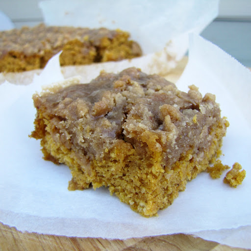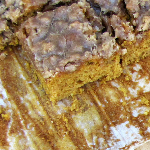 Sweet, moist pumpkin cake topped with a crunch streusel…and topped with a cream and brown sugar glaze. What’s not to like about this?