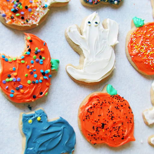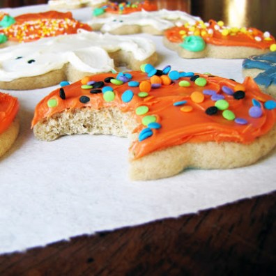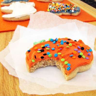 Good ol’ fashioned cut out sugar cookies for the holidays are one of my favorite childhood memories, and a tradition that I am carrying on with my kids. Today my daughter and I spent the afternoon using Halloween cookie cutters to make (and then decorate) sugar cookies for my husband’s work. This time, however, we made a much more interesting and flavorful cookie- by adding cinnamon to the dough.