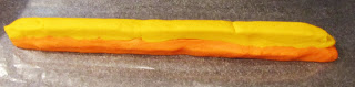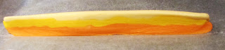 Shape each portion of dough into two 8-in. logs. On a piece of wax paper, flatten top and push sides in at a slight angle. Place orange logs on yellow logs; push the sides in at a slight angle. Top with white logs; form a rounded top.