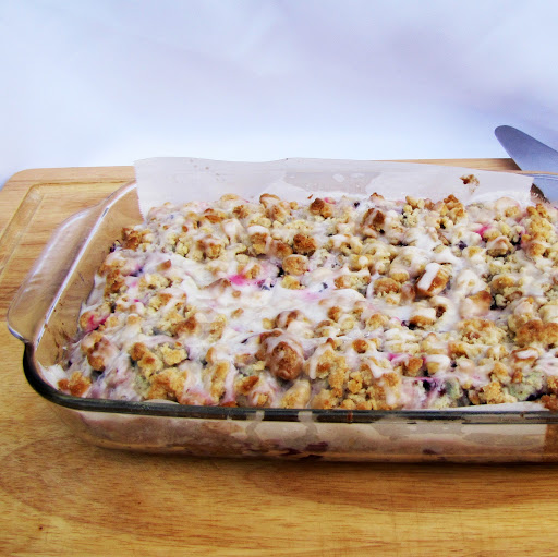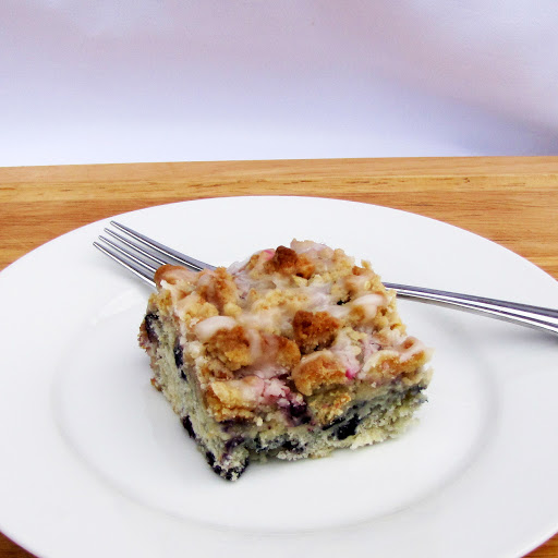 Have you ever tried Blueberry Buckle? It is basically a hokey name for a blueberry coffee cake topped with streusel.  I took mine, and added some subtle lemon flavors to the batter and then made a crumbly, buttery, and sweet streusel for the top using Savannah Smiles cookies.  I then covered the entire thing with an amazing lemony glaze.