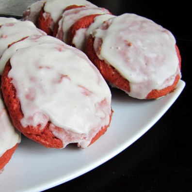 In a medium bowl, cream together the 1/2 cup of butter and white sugar. Add pumpkin, egg, and 1 teaspoon vanilla to butter mixture, and beat until creamy. Add red food coloring (up to 3 TBSP until you get the color you like.) Mix in dry ingredients. Drop on cookie sheet by tablespoonfuls; flatten slightly.