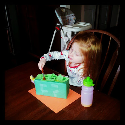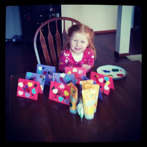 Even though we aren’t in pre-school yet, we made handmade Valentines which she decorated with hearts and glitter and stickers and mailed off to her Grandparents, Aunts and Uncles and her little friends.
