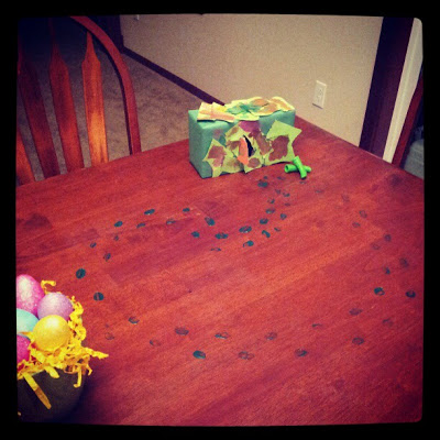 My daughter didn’t catch that sneaky leprechaun, he got away as leprechauns do, but first he left her 3 chocolate gold coins and tiny little green foot prints all over the kitchen table.