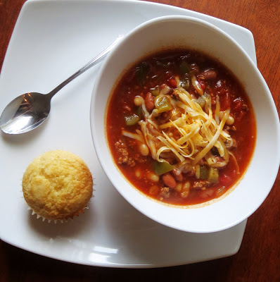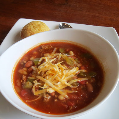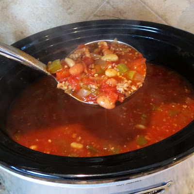I did make a couple of changes; I halved the recipe (if you make this entire recipe, you will have a butt-ton of chili), I made mine in the crockpot, and I used Great Northern beans instead of kidney beans, because I prefer them.